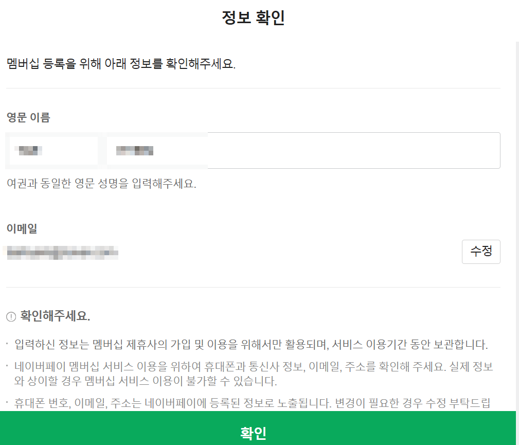 최초로 네이버페이 대한항공마일리지로 전환시에는 먼저 대한항공 멤버십을 등록해야 합니다. 동의 및 적립 후 정보를 입력하고 [+ 멤버십 등록]을 눌러 여권과 동일한 영문 이름을 입력하면 대한항공 SKYPASS 등록을 쉽게 완료할 수 있습니다.
