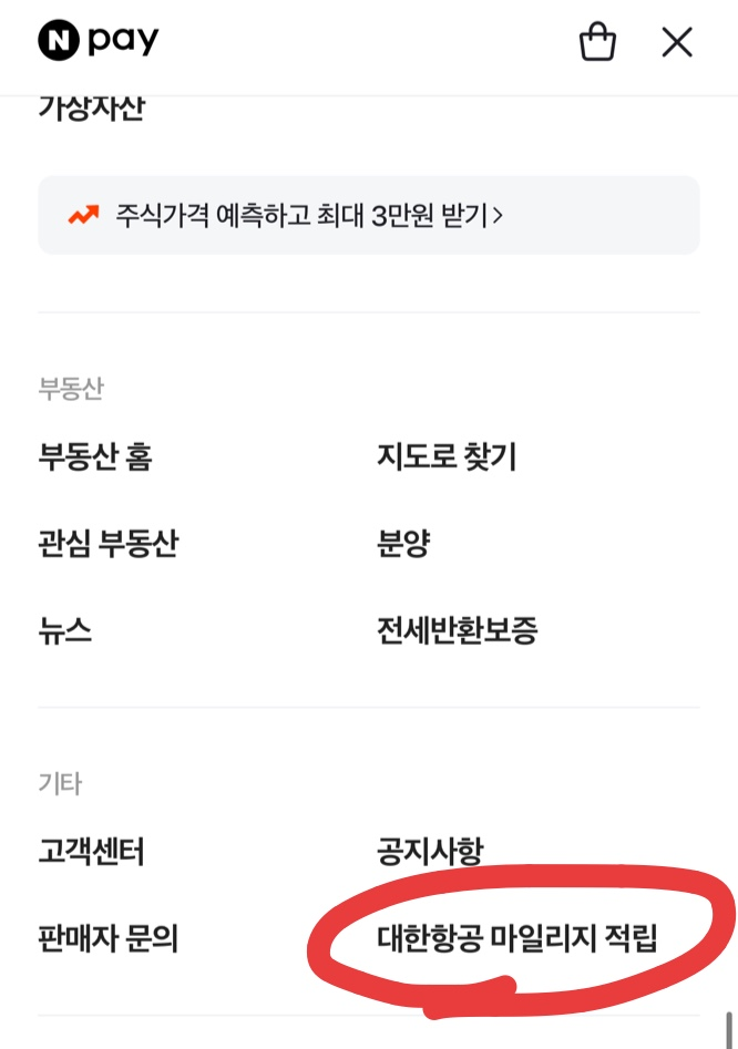 네이버 모바일 앱에서 네이버 페이 페이지에서 [대한항공 마일리지 적립]을 클릭해 주세요. 모바일 앱에서는 네이버 페이 페이지 오른쪽 상단의 三 아이콘을 탭 하고 끝까지 낮추면 쉽게 찾을 수 있습니다.