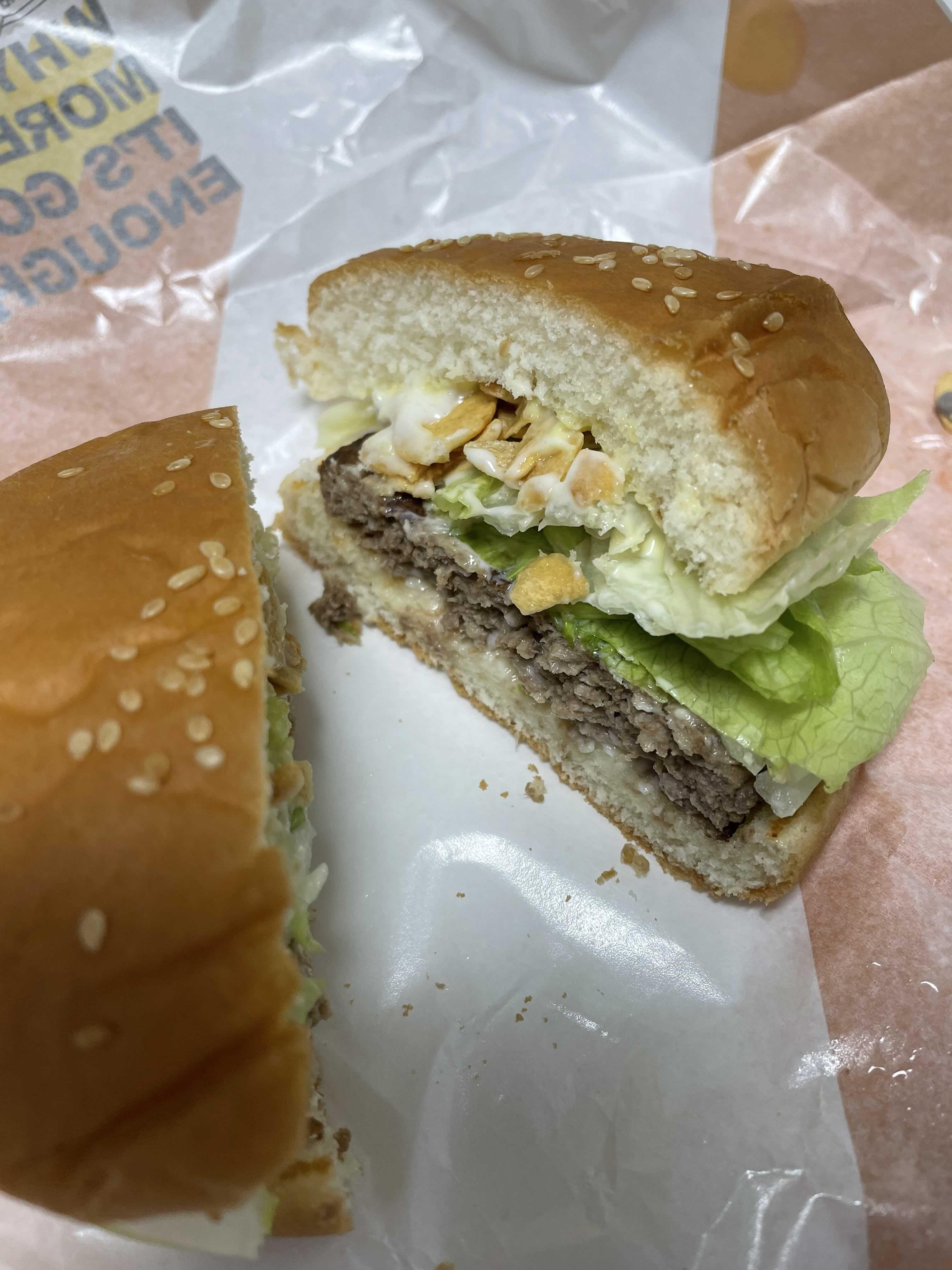 작은 빵안에 얇게깔린 양상추와 패티.. 그리고 마요네즈 버물인.. 아주 얇게깔린 마늘 슬라이스 칩.. 반대편 패티쪽에는 그냥 마요네즈만 발려있네요. 한입 크게 베어물어봤는데 맛이 없다고 할 순 없지만.. 그냥 2,900원의 맛이 났달까.. 마늘 슬라이스칩이 조금 더 많았다면 어땠을까? 하는 아쉬움이 굉장히 많이 남았어요.
