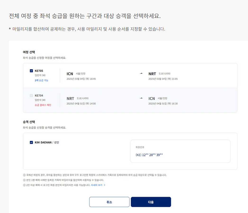 - 일반석에서 프레스티지석으로의 좌석 승급도 대한항공 마일리지 공제표에 따라 마일리지가 공제됩니다.
