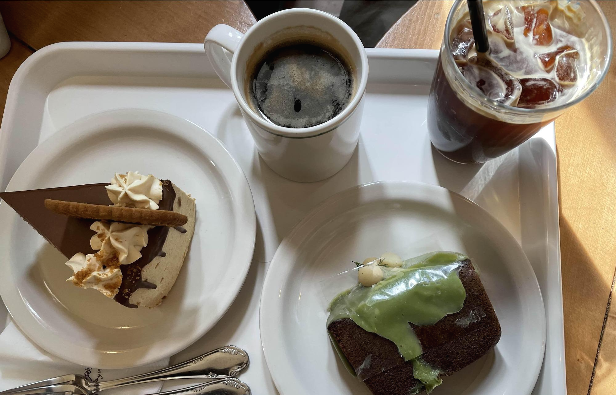 저희가 시킨 디저트는 마차 파운드케이크와 로투스카라멜 케이크인데요. 개인적으로 로투스카라멜 케이크는 비주얼 대로의 맛이 났어요. 맛있긴 한데 특별함은 없는 느낌이었습니다. 다만, 마차 파운드케이크는 너무 맛있더라고요. 마차 좋아하시면 꼭 드셔 보시길 추천드려요.