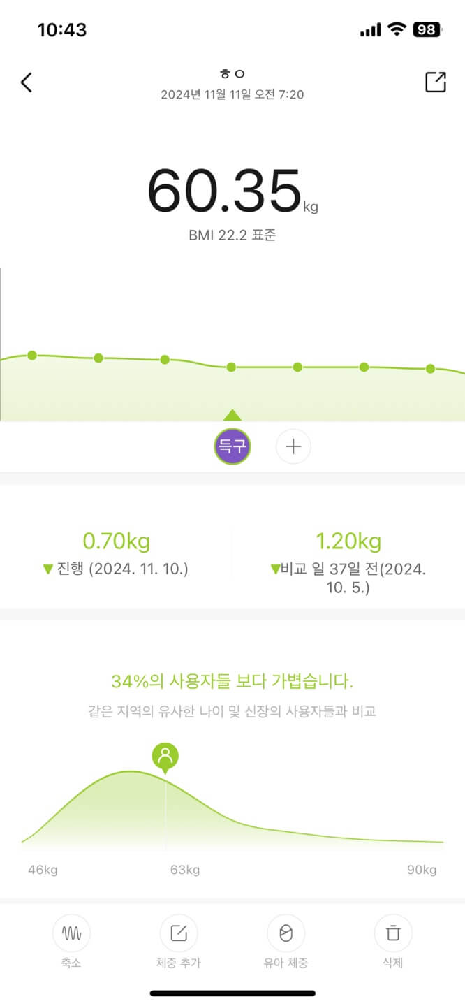 10월14일 시작몸무게 63.55kg에서 10월 31일 58.8kg 을찍고 최종 11월 11일 60.35kg으로 마무리했네요.