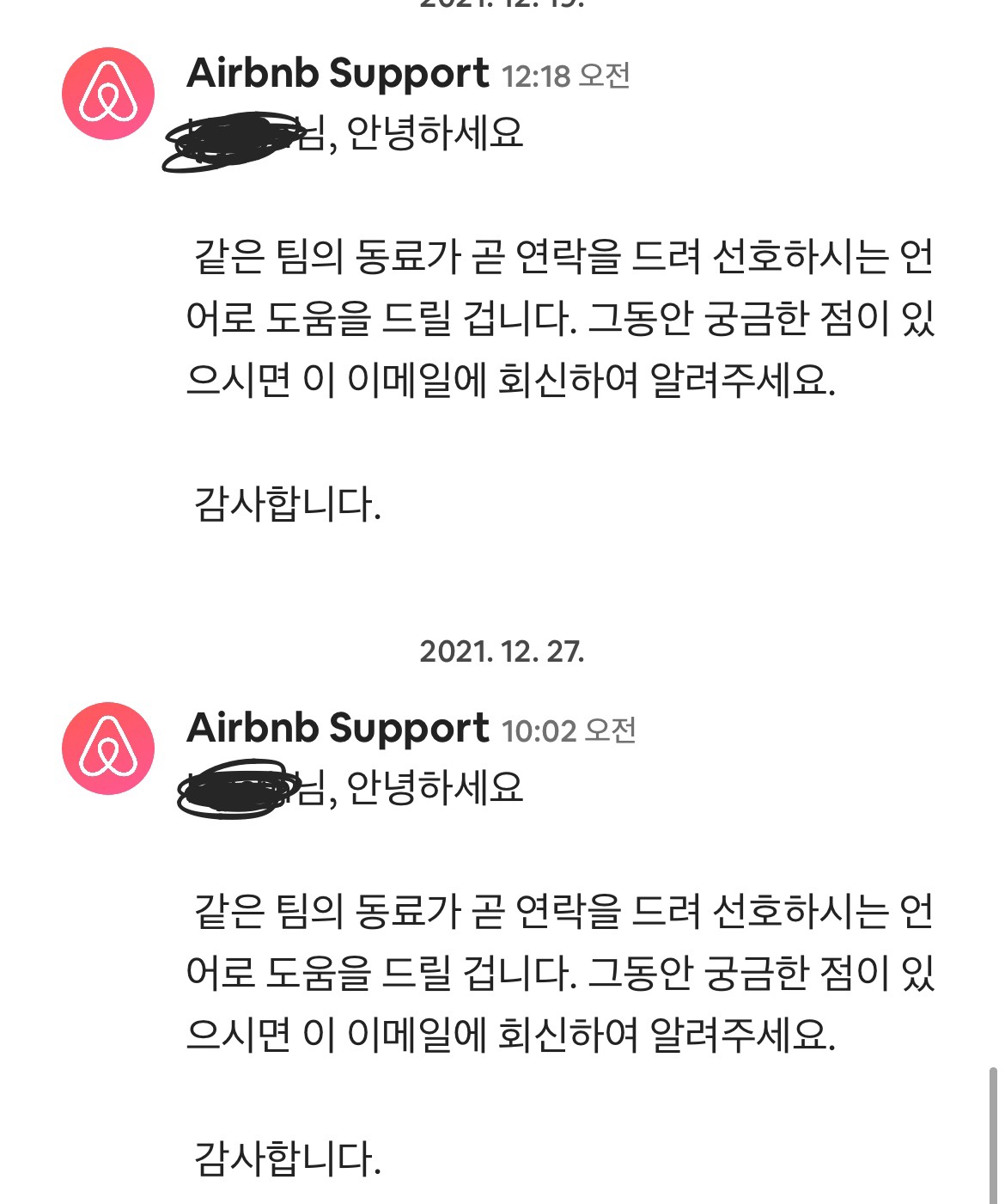 현지시간으로 약 오전 1시쯤 에어비앤비에서 연락이 오더라구요. 이미 문제가 될만한 내용은 앞에서 다 작성했기에 간단히 환불해달라고만 메시지를 보냈습니다. 근데 역시 회사나 고객센터 특성... 그놈의 담당자 연결ㅜㅜ 아마.. 한국숙소가 아닌 해외숙소여서 더 그런 것 같기도 합니다.