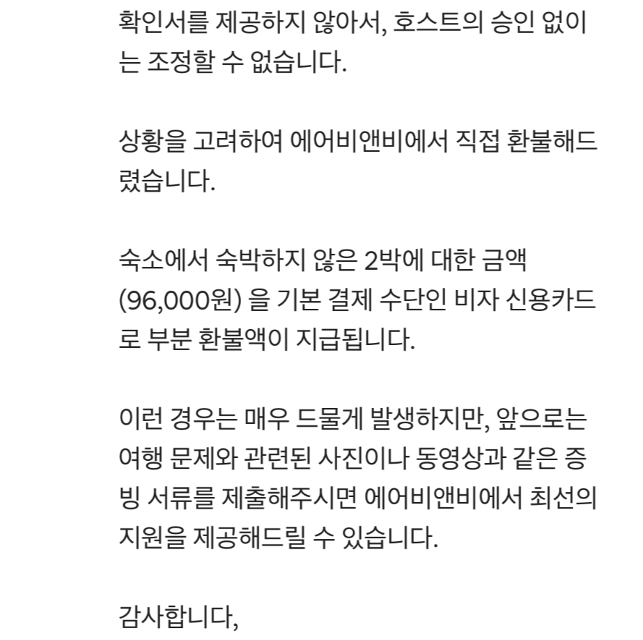 그렇게 에어비앤비에서 직접 환불을 해주겠다고 하네요. 저도 진짜 놀랬어요. 에어비앤비 환불후기 보면 대부분 못받은경우가 많던데 사진을 열심히 찍어놓은 덕분일까요? 제가 직접 작성했던 금액에 대해서 환불을 해주었네요. 덧붙여 이런 경우가 매우 드물게 발생한다고 강조해두었네요. 그래도 이런식으로 적절히 조치해줘서 정말 에어비앤비에 고마울 따름입니다. 다신 쓰지 않겠다 다짐했는데 이러면 다시 이용하죠..ㅎㅎ