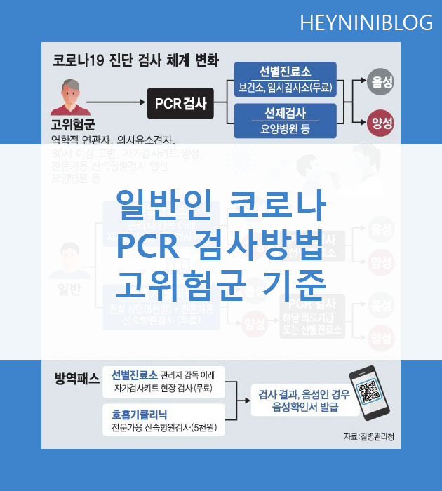 많은분들이 궁금해하실부분이 바로 일반인 코로나 PCR 검사 방법과 검사절차일텐데요. 고위험군 기준에 해당하지 않는 사람의 경우 선별진료소를 방문해도 이제 PCR 검사를 받을 수 없습니다. 먼저 선별진료소에서 PCR 검사를 받을 수 있는 고위험군 기준을 살펴보도록 하겠습니다.