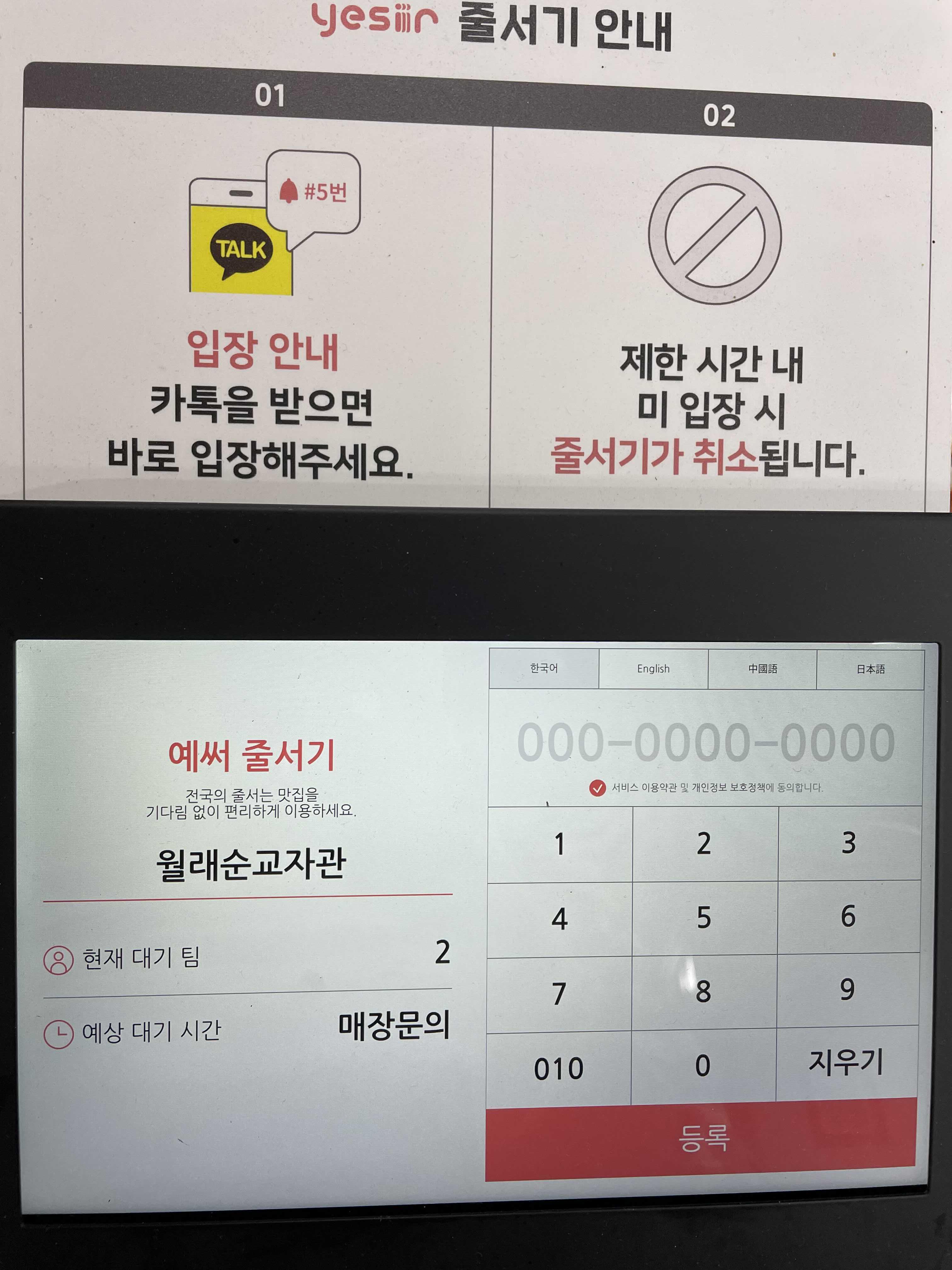 입구에 들어가면 웨이팅 키오스크 기계가 있는데 예약을 걸어주면 된다. 사진에서 매장 내부가 보이다시피, 매장이 넓지는 않다. 오른쪽에 열좌석 정도 더 있었던것 같다. 다행히 약 15분 가량 기다리고 입장했다. (평일저녁 7시기준)