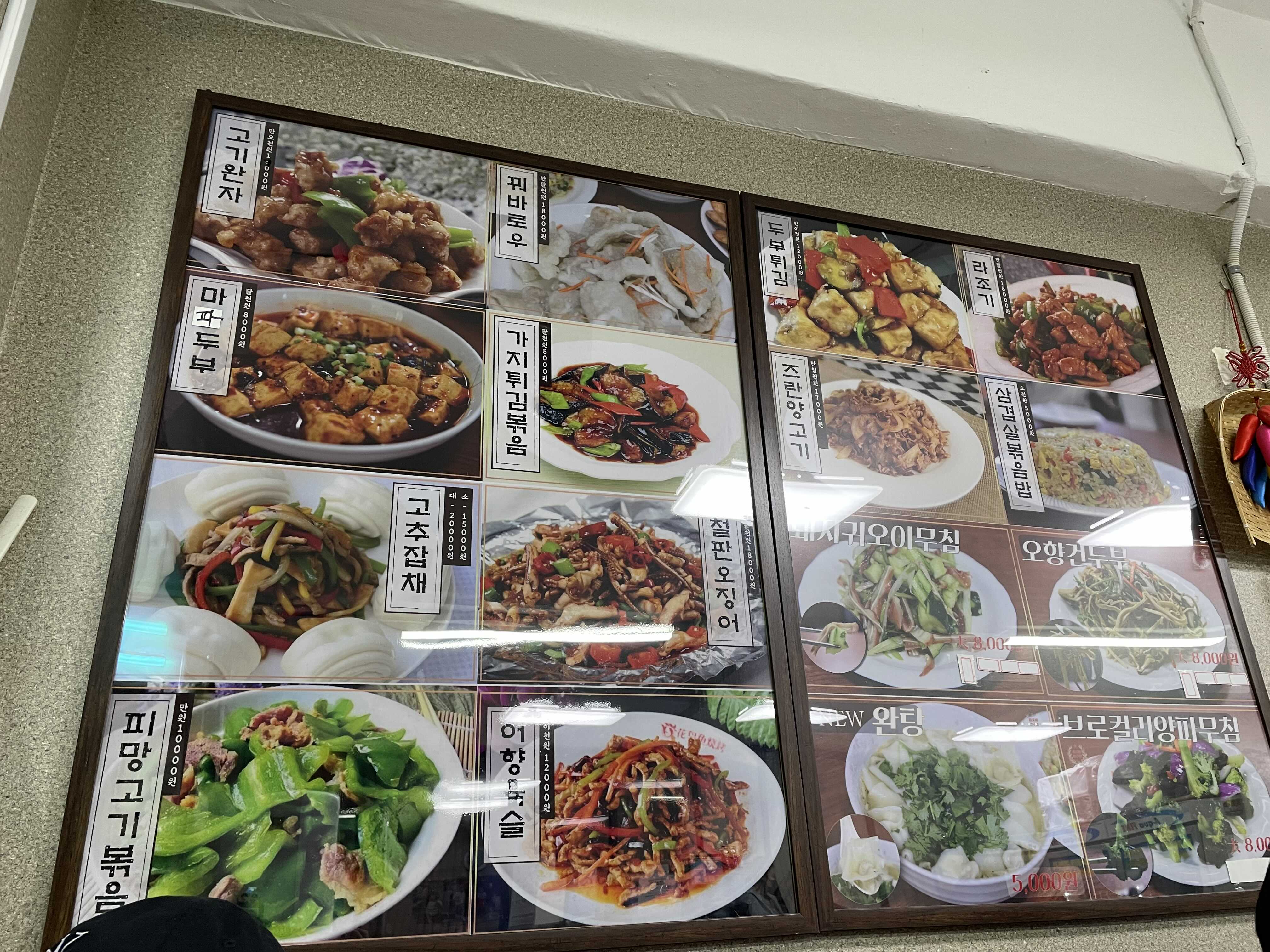 월래순교자관 메뉴판, 정말 다양한 메뉴가 있었는데 거의 시도해본적 없는 메뉴라서 안전하게 시켰다. 내가 열심히 서치해둔바로는 군만두랑 꿔바로우 가지튀김이 가장 인기가 많았었다. 그치만 꿔바로우는 가격도 18,000원으로 부담스러운 느낌도 있었고 그날은 조금 땡기지 않아서 군만두+가지튀김+계란볶음밥 세가지 조합으로 주문을 했다.