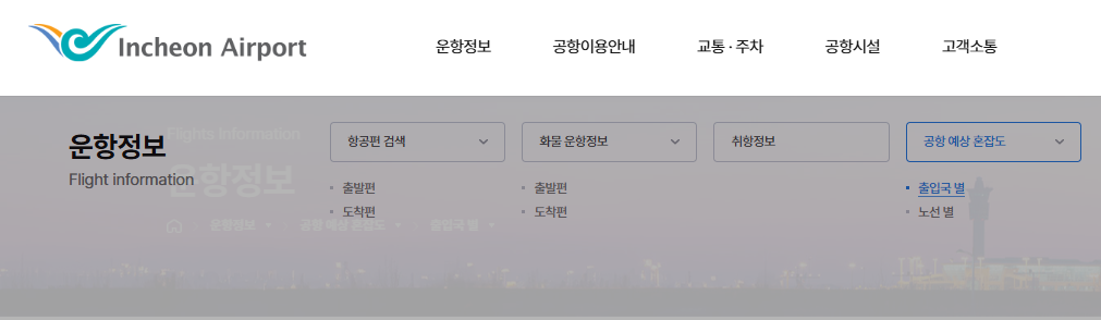 - 혼잡도 확인 방법: 메인화면 전체메뉴 클릭 -> 실시간 공항정보(출국)-> 출국승객예고