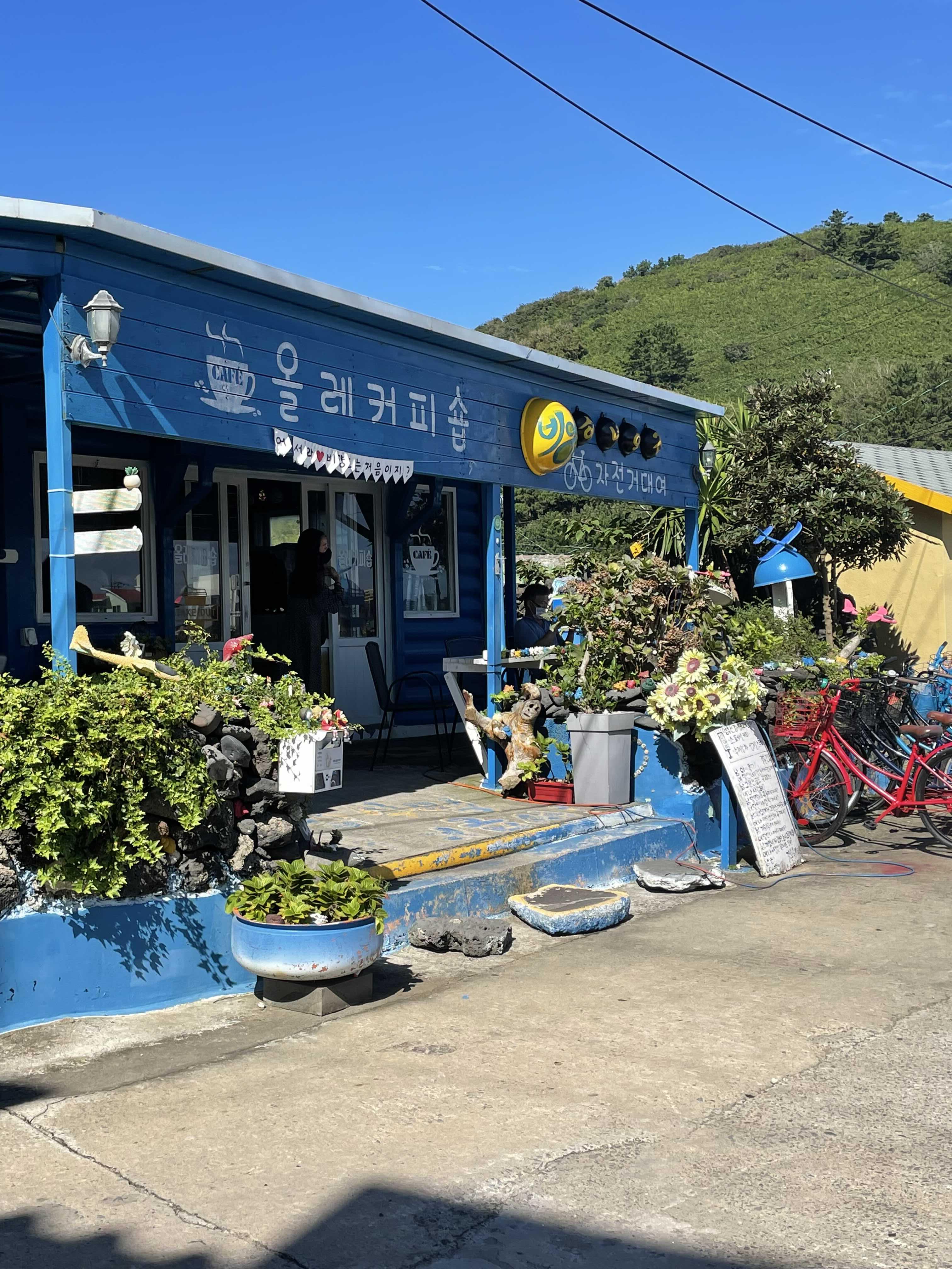 이제 내려오셔서 또 걷다보면 자전거 대여가 가능한 '올레커피숍'이 나오는데요. 저는 여기서 자전거 대여해서 한바퀴 둘러보는것을 추천드려요. 저는 오후 일정에 해안도로 전기자전거를 탈 일정이 있어서 대여를 하지 않았는데, 하지 않은 저자신에게 딱밤을 한대 때리고 싶었답니다.