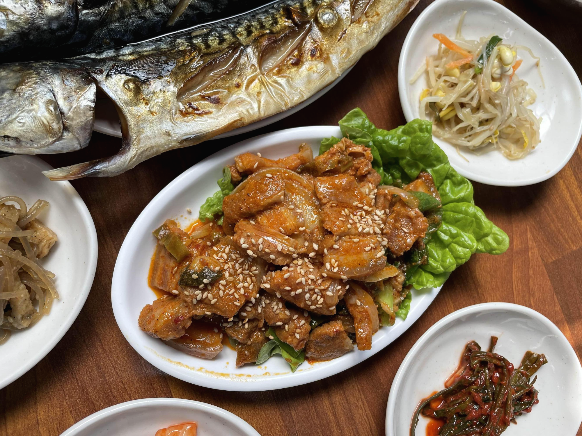 엄마정식의 메인메뉴인 고등어와, 제육볶음, 밑반찬 6가지와 미역국, 쌈이 나왔습니다. 제가 가장 만족스러웠던 부분이 밑반찬 6가지가 모두 맛있었다는 점인데요.