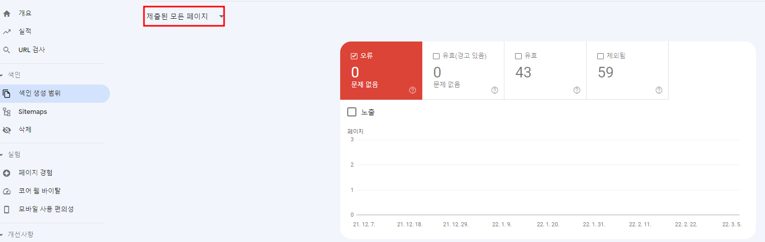 1. 구글 서치콘솔에 접속한 뒤, 색인 생성 범위를 클릭한다. 왼쪽 위쪽에 알려진 모든 페이지 -> 제출된 모든 페이지로 바꾼다.