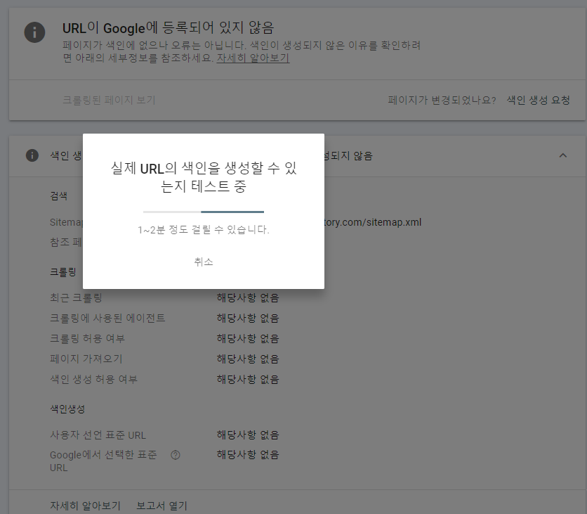 4. 이렇게 누르고 보면 아래에 다양하게 나오는데, URL이 구글에 등록되어 있지 않다고 뜨네요. 색인 생성요청을 눌러줍니다.