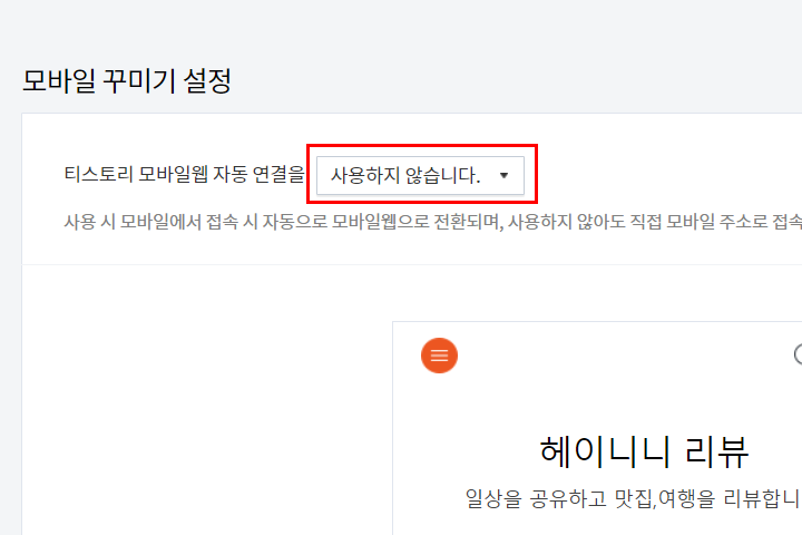 그다음 모바일웹 자동연결을 반드시 '사용하지 않습니다'로 설정해주세요. 티스토리 모바일 어플이 있는데, 이 어플형식으로 연결된다는 설정입니다. 스킨이나 광고가 제대로 보이지 않을 수 있으니 반드시 해제해주세요.
