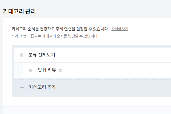 그다음 카테고리 관리를 가서 카테고리를 생성해주세요. 초반에는 많은 카테고리 설정할 필요 없다고 하고. 오히려 많은 카테고리는 독이 될 수도 있다고 합니다.