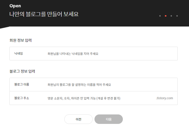 개인정보 동의를 하면 아주 간단하게 가입이 완료됩니다. 그다음 기본적인 정보를 입력해주시면 됩니다. 닉네임은 아무렇게나 해주셔도 상관 없다고 합니다. 단 블로그 이름의 경우 키워드를 무작위로 나열하면 좋지 않다고 하니까 참고해주세요! (ex 여행 맛집 주식 블로그 -> X)