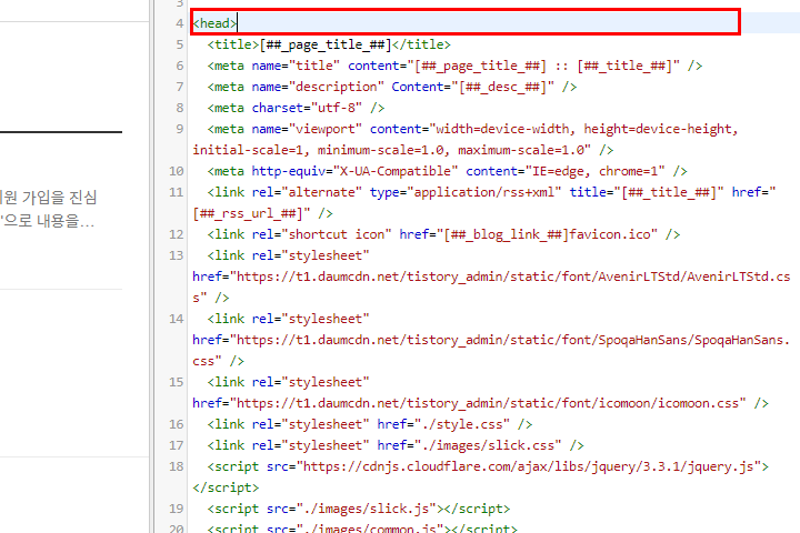 그후 HTML태그를 계정설정 -> 꾸미기에 들어가서 html편집을 눌러 저 위치에 복사해서 넣어주시면 됩니다.