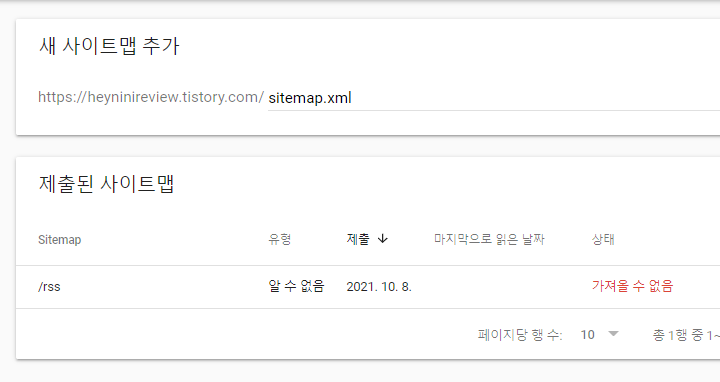 하단에 제출된 URL이 보이네요. 문제없이 잘 된것 같습니다. 그다음은 사이트맵 제출입니다. 내 주소뒤에 sitemap.xml을 입력해주시면 됩니다.