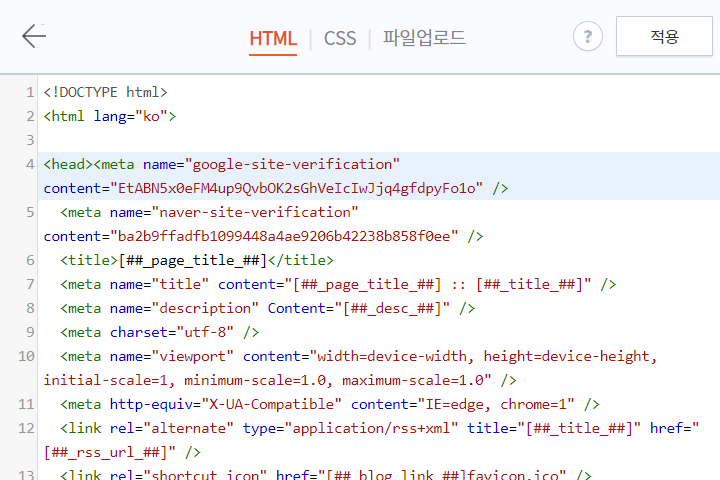 계속을 누른다음 쭉 내려서 html 역시 복사한 다음 아까 네이버 설정을 할때와 같이 티스토리 블로그 설정 -> 꾸미기탭 스킨편집에서 다시 복붙 해줍니다.